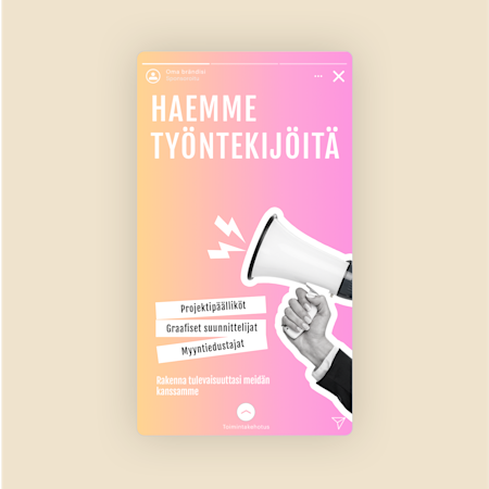 Jokainen mallipohja sisältää kuvan tai grafiikan, jossa on yksi tai useampi tekstiruutu, joita kaikkia voi muokata kätevästi brändiisi sopiviksi. Voit myös ladata omia kuvia tai valokuvia ja lisätä tekstiä ja grafiikkaa muokkaustyökalullamme. Mallipohjien suosittuja käyttötarkoituksia ovat esimerkiksi alennusmyynnit, mainoslahjat, avoimien työpaikkojen ilmoitukset, tuotteiden esittely sekä bränditarinoiden ja asiakaspalautteen jakaminen. Lopulta jokainen päättää itse, miten näitä mallipohjia soveltaa brändiinsä!