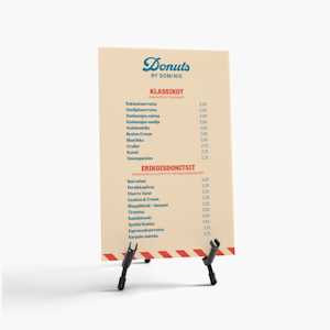 Oletko valmis aloittamaan? Voit valita kirjastomme mallipohjista, ladata oman mallisi tai aloittaa alusta ja antaa mielikuvituksesi lentää. Tarvitsetko apua? Voit yhdessä suunnittelutiimimme kanssa luoda räätälöidyn ruokalistan, joka kuvastaa brändiäsi aidosti. Kun olet tyytyväinen malliin, painamme ruokalistat laadukkaalle Foamex-levylle. Ne ovat valmiina esillepantaviksi houkuttelemaan nälkäisiä asiakkaita.